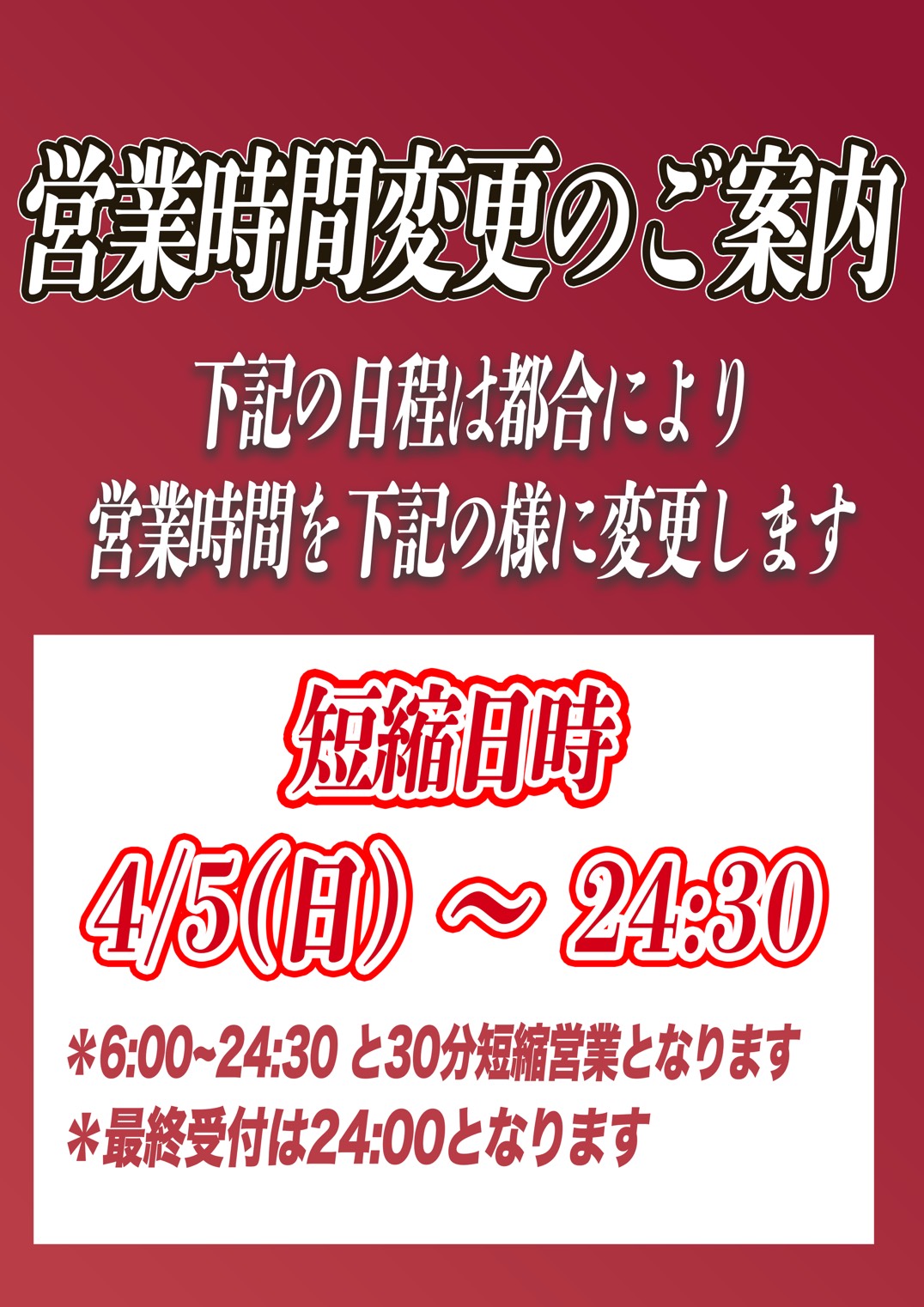 【営業時間変更のお知らせ※本日4月5日のみ】 2026年4月5日 4月5日(日)は、営業時間を24:30までとさせていただきます。通常は25:00まで営業しておりますが、当日に限り営業時間を短縮して営業いたします。※最終受付は24:00となります。ご来店を予定されているお客様は、お時間にご注意くださいますようお願いいたします。 2階休憩所 無料開放のお知らせ